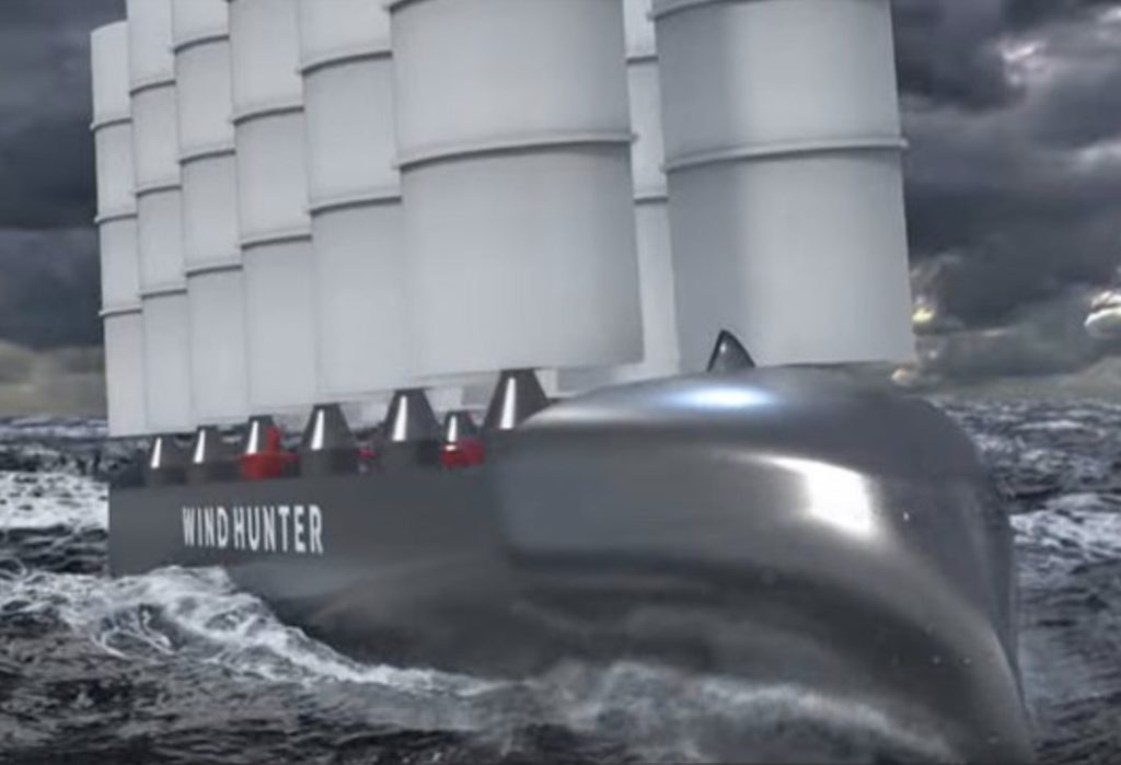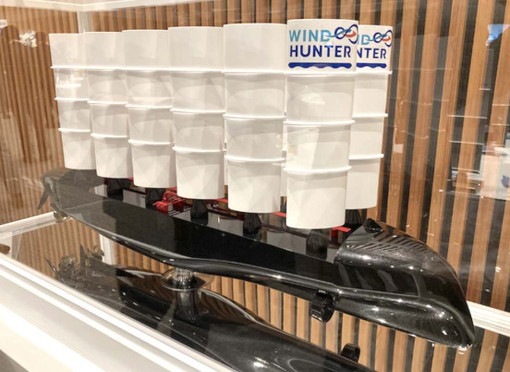 同社は10月、船首に「硬翼帆」と呼ばれる風力推進装置を取り付けた石炭輸送船「松風丸」の運航を開始しましたが、ウインドハンターは、最大高さ53mにもなるこの硬翼帆を、甲板に10基も取り付けているのです。