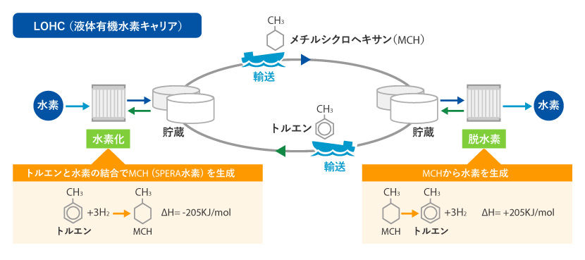 水素は、究極のクリーンエネルギーとなりえますが、その輸送が課題であるといわれてきました。水素をトルエンと反応させて得られるMCHは、常温・常圧の液体であるためハンドリングが容易です。