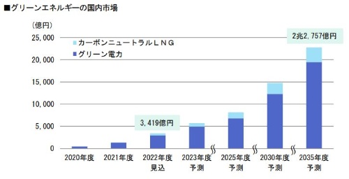 全ての電力を再生エネでまかなうことを目指す国際的な企業連合「RE100」やESG(環境・社会・企業統治)投資など社会的な環境価値への意識の高まりや政策によってグリーンエネルギーの提供事業者は増加。2035年度のグリーン電力市場は1兆9459億円となる見込みとのこと。同年度のカーボンニュートラルLNG市場は3298億円となり、ガス小売市場に占める割合が1割を超える見通しとのこと。
