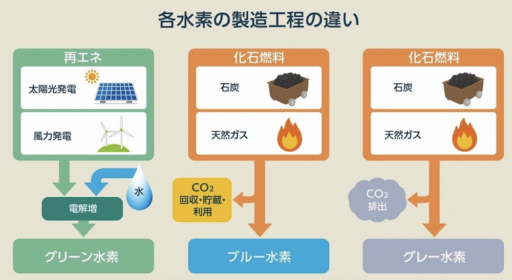 水素基本戦略では、「低コストな水素利用の実現」として、海外の安価な未利用エネルギーとCCSを組み合わせる水素(ブルー水素)、または安価な再エネから作られる水素(グリーン水素)を大量調達するアプローチを基本的な考え方としている。