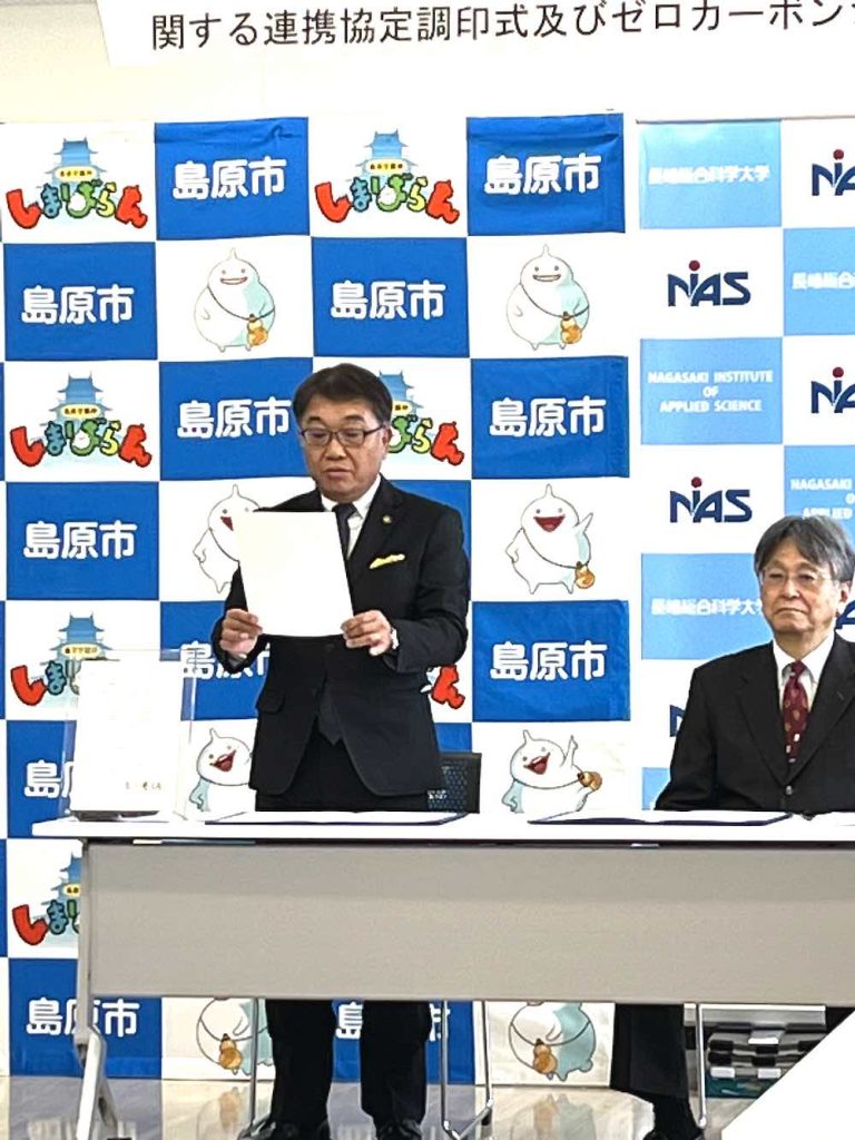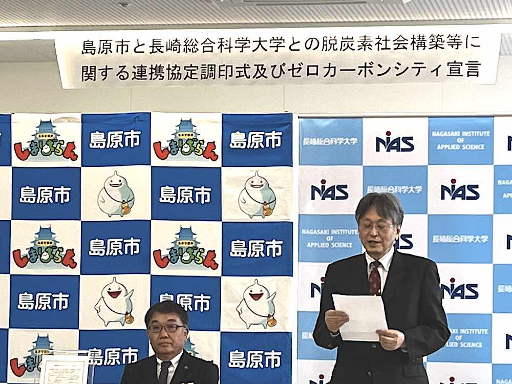 島原市と長崎総合科学大学との脱炭素社会構築等に関する連携協定調印式に続き