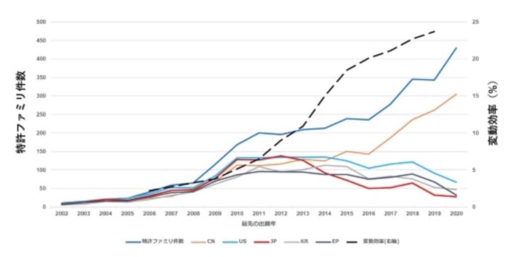 ペロブスカイト太陽電池の研究開発は、最終的に日本の宮坂教授が完成させる前にも世界で行われてきた。その後、2009年に基本特許が発表されたことから一気に研究開発が加速した。ところが、2013年以降、中国を除いて特許出願件数は減少に転じる。通常、こうした画期的な発明が行われると、世界中で開発競争がしばらく続いた後に淘汰が起こるのだが、今回の欧米諸国の撤退は早かった。この背景には、中国の積極的な特許出願があり、仮に後続発明に成功したとしても、シリコン系太陽電池と同様の展開となり、中国勢に価格でかなわないと判断したことが大きいと思われる。