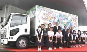 水素の貯蔵タンクが2本搭載されていて、走行の際に二酸化炭素を排出せず、1回の充填でおよそ260キロ走ることができます。車体には、中学生が1本1本描いた色とりどりの花がデザインされていて、早速、発表会のあと車が出発しました。