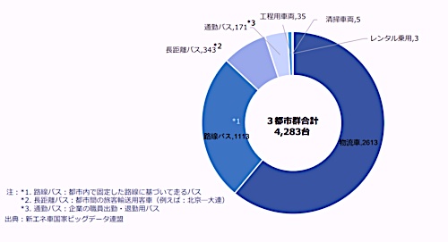 2022年の北京冬季五輪では選手や関係者の移動手段として約1000台のFCVが使用されたことも話題になりました。以下の図からも車両用として乗用車は極めて少なく、大型トラックなどの物流者やバスへの普及が多くなっています。