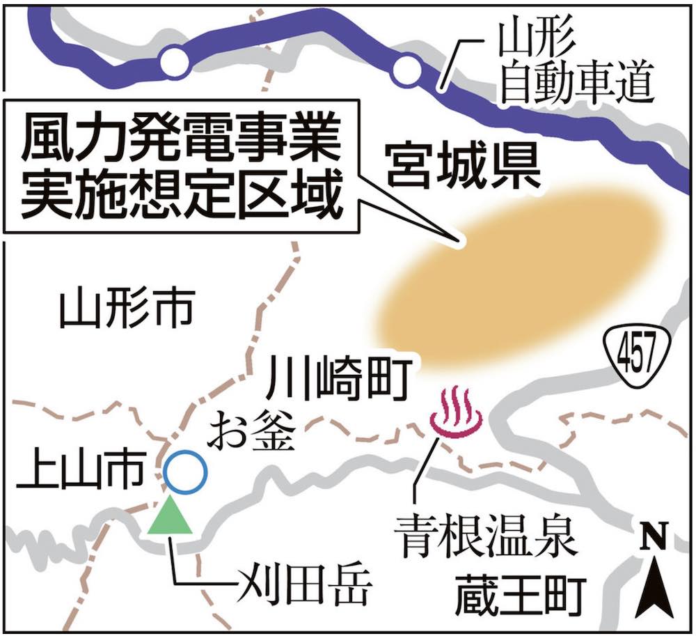 [関西電力による蔵王山麓の風力発電事業] 当初は川崎町前川地区の1600ヘクタールに高さ最大約180メートル、直径約160メートルの風車23基を建設する計画だった。最大出力9万6600キロワット。2028年度着工、31年度の運転開始を目指すとした。予定地の一部に蔵王国定公園が含まれたため、県環境影響評価技術審査会が計画を疑問視。関電は6月20日の住民説明会で予定地から蔵王国定公園を外し、風車を19基に減らす方針を示した。