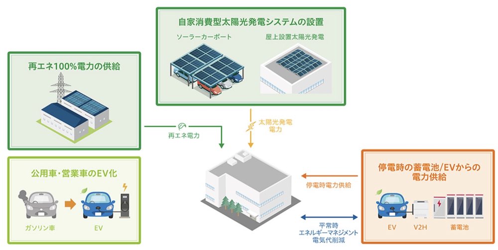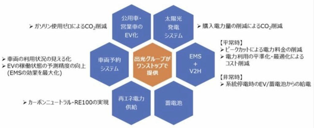 サービスは出光興産のメンテナンス付きカーリースサービス「オートフラット」でEVの提供も可能。自家消費型太陽光発電システム、充放電設備に加え、平常時にはEVの充放電を最適制御してエネルギーコストや環境負荷を低減するEMS、車両予約システムを提供する。