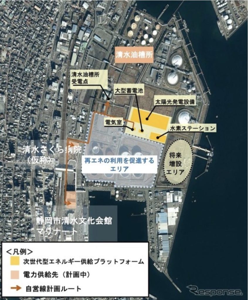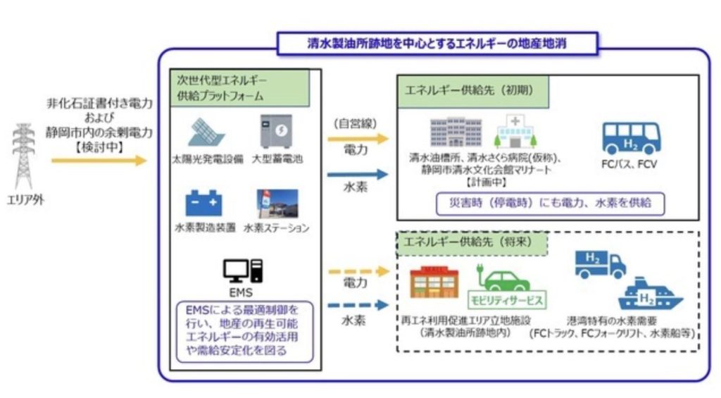 清水製油所跡地に太陽光発電設備、大型蓄電池、自営線、水電解型水素ステーションなどを設置する。再生可能エネルギー由来の電力と水素(グリーン水素)を製造、供給する。水電解型水素ステーションは静岡市内で初の取り組みとなる