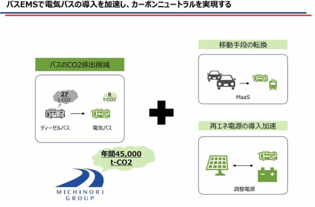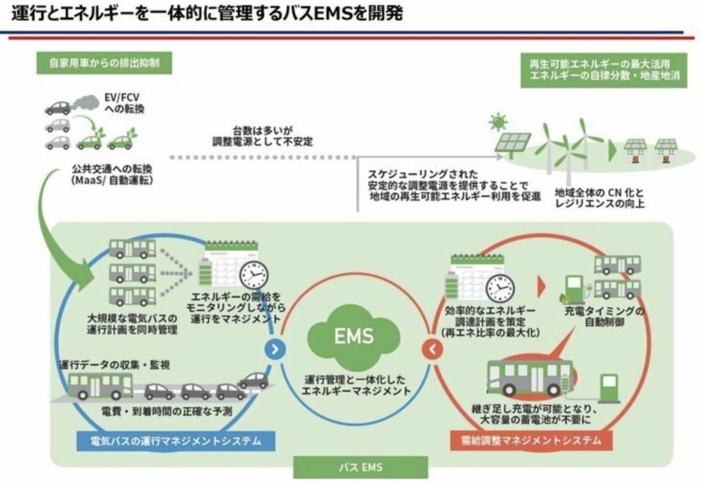 会見の中で、みちのりHDの松本CEOは、「カーボンニュートラル(以下:CN)が叫ばれる中、バスの電動化はそれを達成する上で重要な取り組みとなる。しかし、ディーゼルのバスと比較すれば20年間で2倍近いコストがかかるという現実もある。そこで重要なのがエネルギーマネジメント(EMS)で、この運用によりディーゼルのバスと同等のコストにすることができる」と説明した。