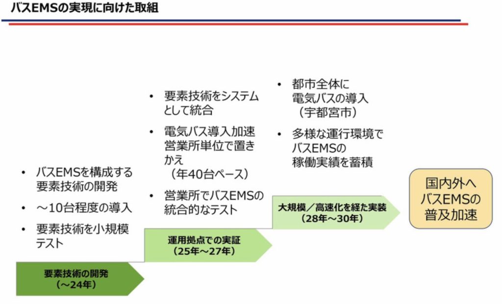 今後の計画では2024年までに、バスEMSを構成する要素技術を開発して10台程度を導入してテストを開始。その後、25~27年において要素技術をシステムと統合し、運用拠点において年40台ペースで投入していく。そして、28年~30年にかけては大規模/高速化を経た実装時期とし、たとえば宇都宮市内全体に電気バスを導入し、多様な運行環境でバスEMSの稼働実績を蓄積していくことにしている。