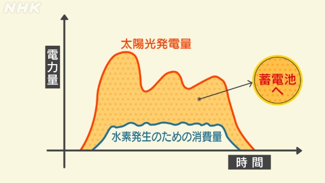 「太陽光で発電する電力」をすべて使おうとするから、合わせるのが難しいのではないか。例えば、水素の発生量を、あらかじめ低めに設定しておく。その量に合わせた電力だけを使い、余った電力は蓄電池に溜めておく。蓄電池に溜めた電気は、夜や雨の日などに水素を作るときに利用する、という方法はとれないのか・・・。
