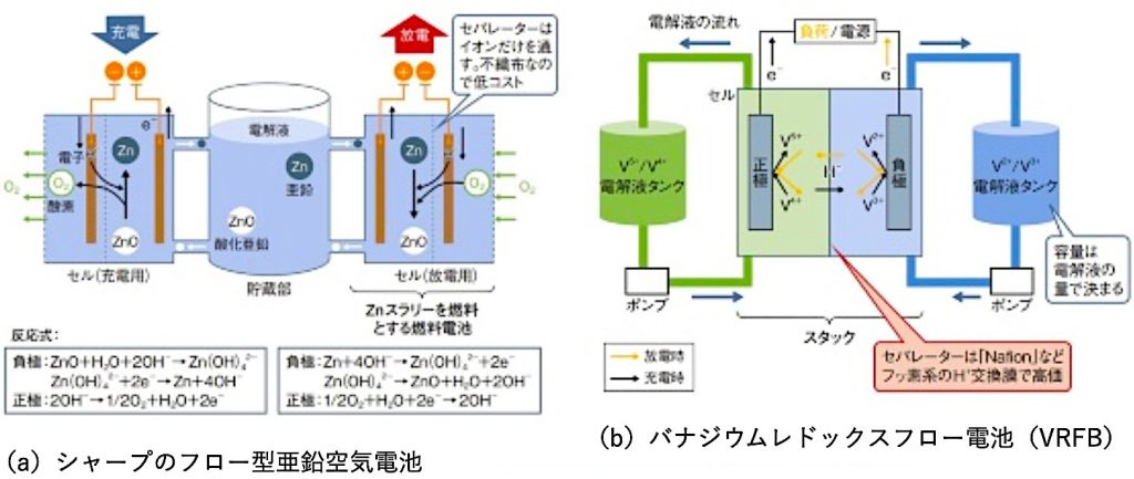 シャープは2022年8月、「カーボンニュートラルの実現に向けた『亜鉛による蓄エネルギー技術』の開発を開始した」と発表した。電解液と電極の活物質が一体となった、いわゆるレドックスフロー電池(RFB)の一種といえ、「フロー型亜鉛空気電池」(同社)とも呼ぶ。2025年度以降の実用化を目指すという。
