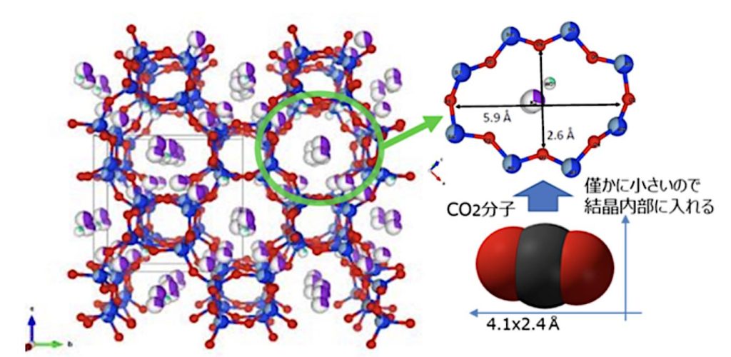 「K-GISゼオライト」の細孔径はCO2より僅かに大きく、CO2は結晶内に入り吸着されますが、それより大きい分子(メタン、O2、N2等)は入ることができないため、高い選択吸着性能を発現できます。