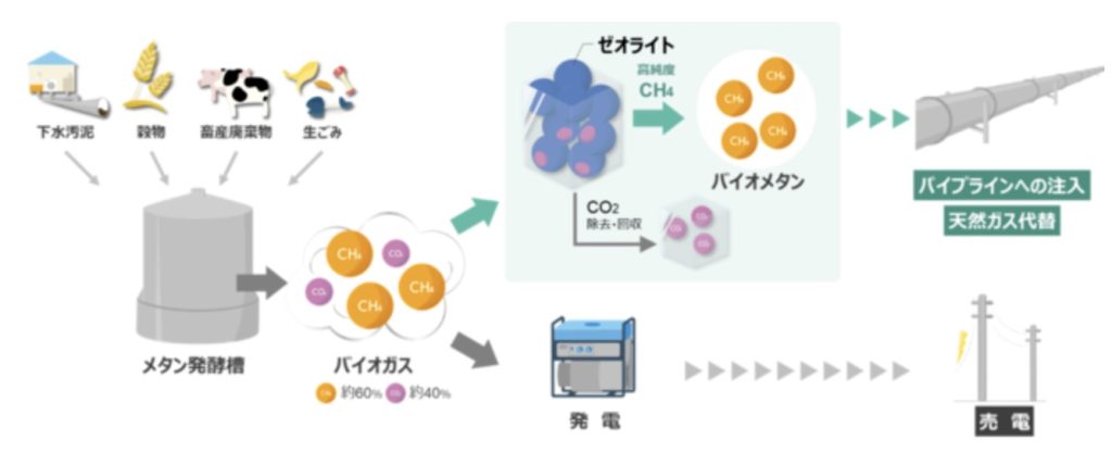 本システムは、当社が開発したCO2を選択的に吸着する新規吸着剤「K-GISゼオライト」を用い、バイオガスからCO2を除去して高純度のメタンガス(バイオメタン)を精製するものです。従来の吸着剤はCO2と同時にメタンも吸着してしまう特性を有していましたが、「K-GISゼオライト」はメタンの吸着が極めて少ないため、高純度のメタンを高効率に分離回収でき、さらに高純度のCO2の回収も可能となります。