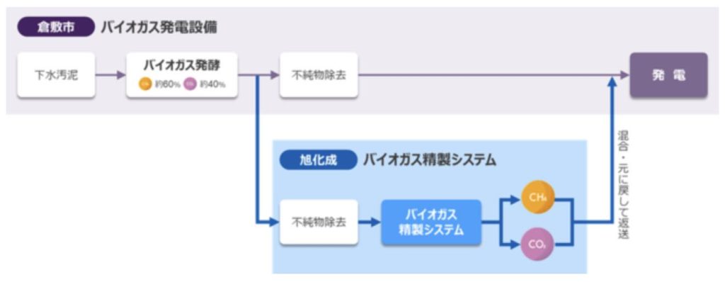 倉敷市では、児島下水処理場にて下水汚泥から発生したバイオガスを用いて発電しています。このバイオガスの一部を本システムに取り入れ、バイオメタンを精製します。