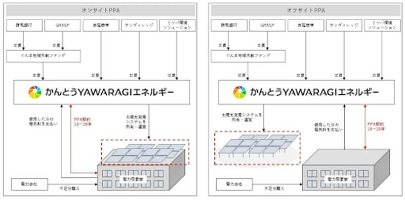 同時期に発表のあった茨城の常陽銀行、長野の八十二銀行に続いて、8月下旬には群馬銀行が、PPAやソーラーシェアリングを行うための事業会社「かんとうYAWARAGIエネルギー」を足利市に立ち上げた。地銀では銀行法改正に伴う4つ目の発電事業会社である。このケースでは、地元の再エネ施工業者などとの共同出資という特徴があり、リリースにPPA(オンサイト、オフサイト)のスキーム図も添えられている“実務型”である。