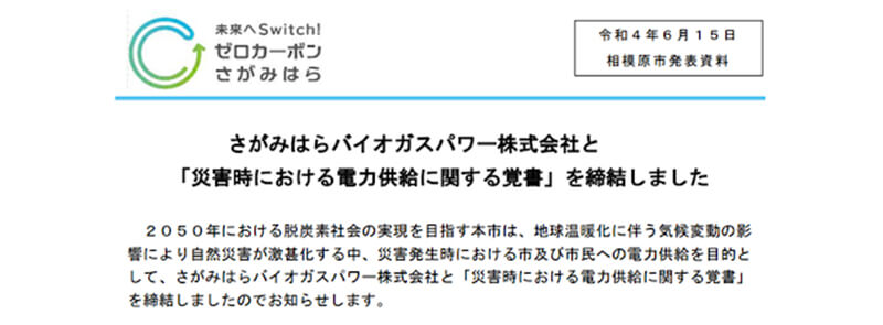 地元の相模原市とは、災害時の協力でつながっている。この6月に締結された「災害時における電力供給の覚書」では、災害時において、このバイオガス発電施設から市及び市民に電力を無償で供給するとされている。
