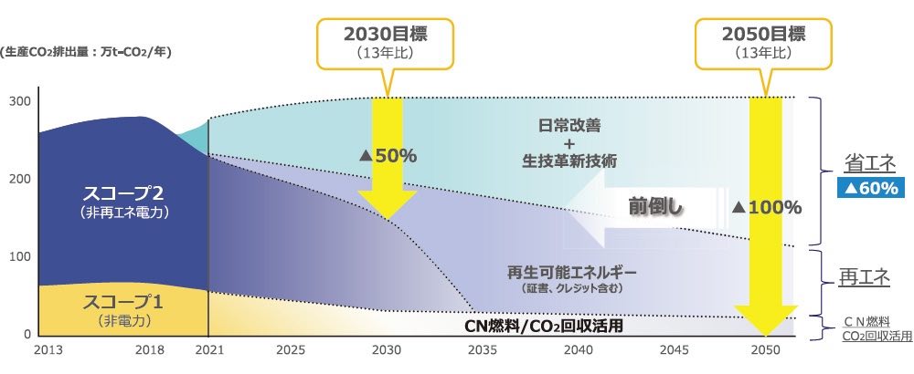 その中で、カーボンニュートラルの実現に向けて、「製品」と「生産」の両軸で取り組む。2019年度の世界でのCO2排出量は、スコープ1、2(生産)で280万t、スコープ3で1454万tとなっている。生産時に排出するCO2の削減シナリオによると、13年比で30年に50%削減、50年に同100%削減を目標としている。
