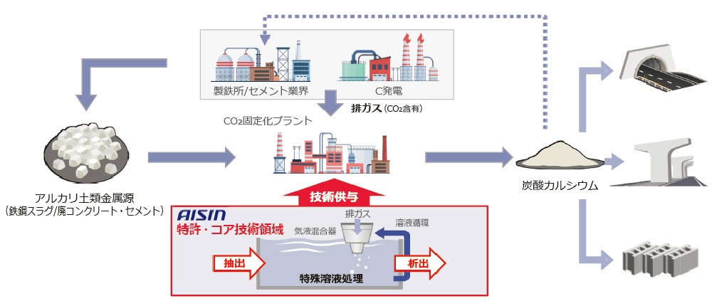 こうした中、アイシンと大成建設は22年4月、共同開発契約を締結した。工場から出るCO2を回収して炭酸カルシウムとして固定化し、コンクリートの原料として活用する。