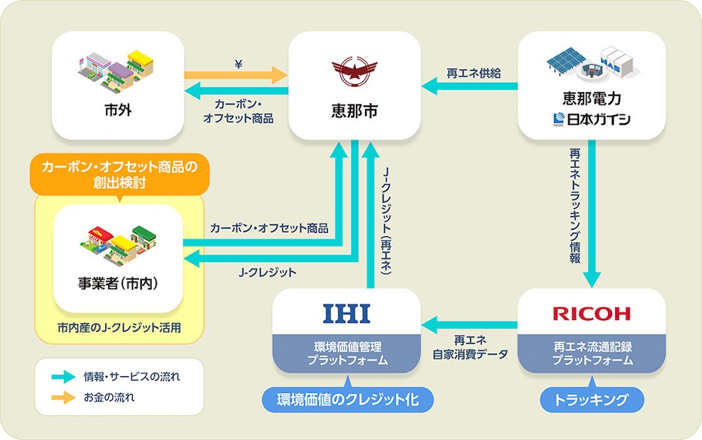恵那市(岐阜県、市長:小坂 喬峰)、日本ガイシ株式会社(代表取締役社長:小林 茂、本社:愛知県名古屋市)、株式会社リコー(社長執行役員:山下 良則、本社:東京都大田区)、株式会社IHI(代表取締役社長:井手 博、本社:東京都江東区)は、地域新電力会社の恵那電力株式会社(本社:岐阜県恵那市)の再生可能エネルギー(再エネ)による発電および売電事業を通じて恵那市が得た環境価値(※1)を、経済的に有償な価値(以下「クレジット」)に変換し利用する脱炭素・経済循環システムの実証事業を2022年10月から開始します。創出されたクレジットを恵那市内で活用し、市外からの資金還流を生み出す仕組みも構築し、地域経済の活性化、さらなる再エネ導入拡大のサイクルを回し、恵那市のゼロカーボンシティ実現に貢献します。