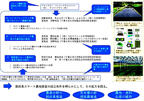 千葉市内に、畑作中心の脱炭素スマート農地に加え、米作の脱炭素スマート農地も設置。化石燃料価格の高騰が見込まれる中、関連投資の長期的な採算性が確保される境界条件を明らかにする。また、ソーラーシェアリングなどに既に取り組んでいる他の地域へ伝えることで、全国的な脱炭素スマート農地の展開をめざす。