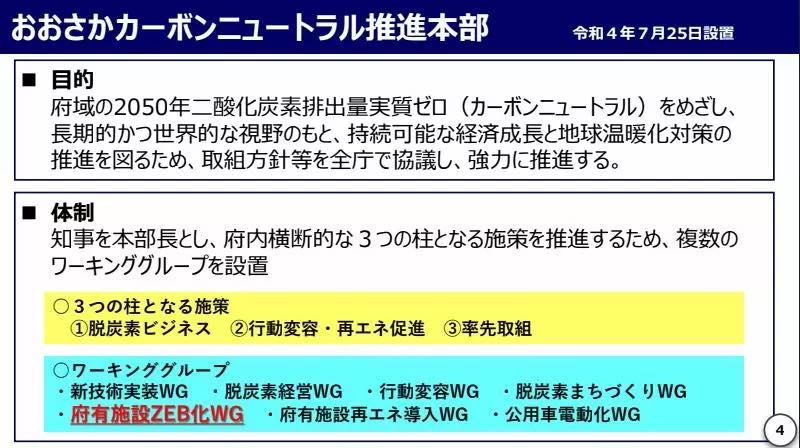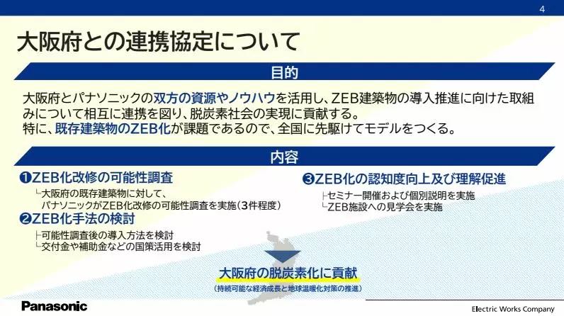 しかし、ZEBというのは近年生まれた概念であり、現在ZEB化が行われている建物は基本的に新築です。つまり、既存の建物をZEB化したという事例はほとんどありません。「そもそも、府が持っている建物をZEB化できるのか?」その可能性から調査していかねばならないフェーズだそうです。今回協定を結んだパナソニックは、その調査を担う役割を務めます。