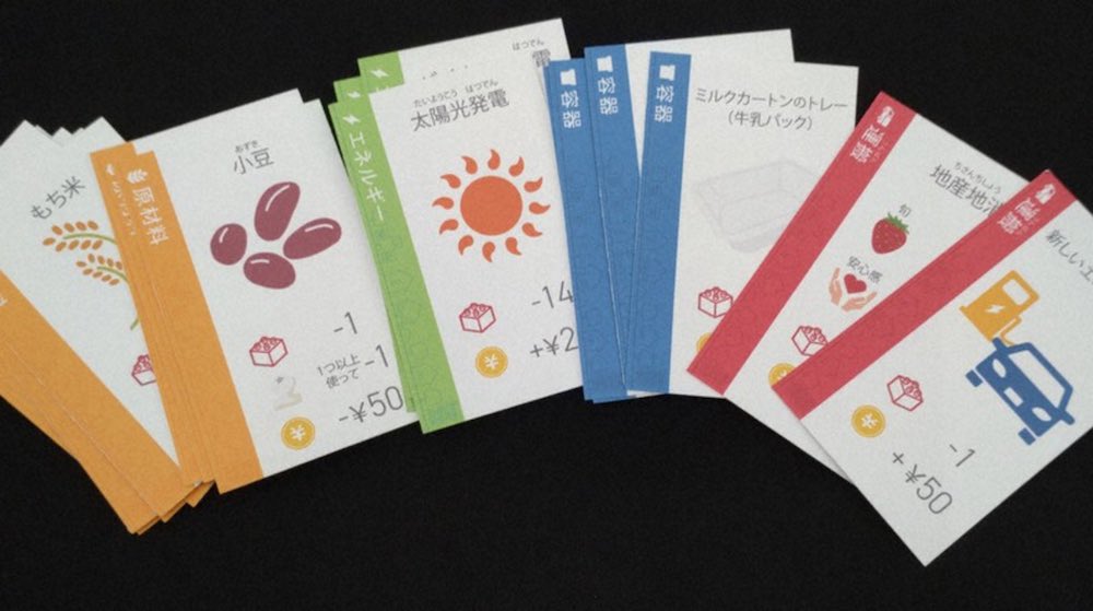 カードゲームは、自分が餅店を経営するという設定。原材料▽容器▽エネルギー▽運搬――などと書かれたカードに、削減できる温室効果ガスの量と、削減にかかる費用が記されている。参加者はこのカードを使い、目標の削減量と金額を設定した上で餅を製造する。
