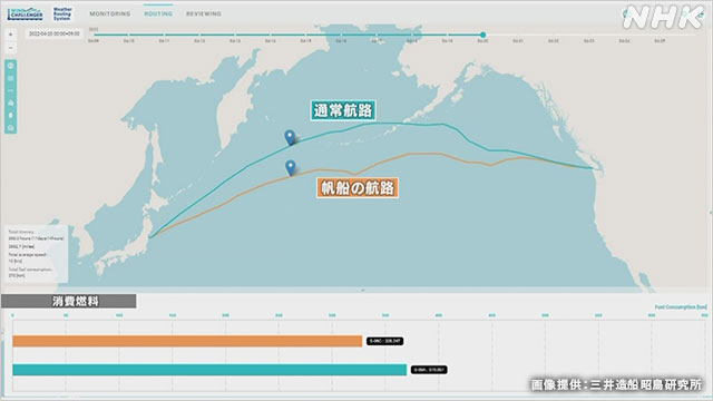 エンジンだけを動力とする通常の船であれば、目的地への最短距離のコースを進みますが、このシステムでは気象データをもとに、航路上の風の強さや向きなどを分析し、風を最も有効に活用できるコースを自動で判断するのです。