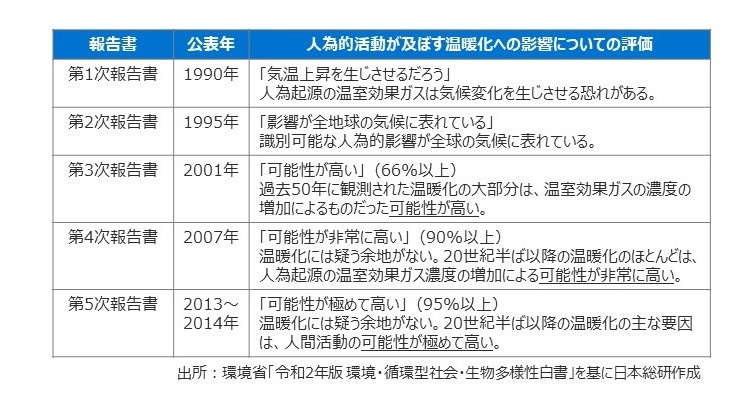 IPCCは、1990年より「人為的活動が及ぼす地球温暖化への影響についての評価の変化」について分析・報告を行ってきた。
