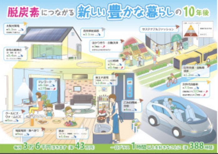 「脱炭素につながる新しい豊かな暮らしを創る国民運動」は、2050年カーボンニュートラル・2030年度削減目標の実現に向けて、暮らし、ライフスタイルの分野でも大幅なCO2削減が求められる中で、国民・消費者の行動変容、ライフスタイル変革を促すべく、衣食住にわたる国民の将来の暮らしの全体像「脱炭素につながる新しい豊かな暮らしの10年後」を明らかにし、具体的なアクションを提案する。