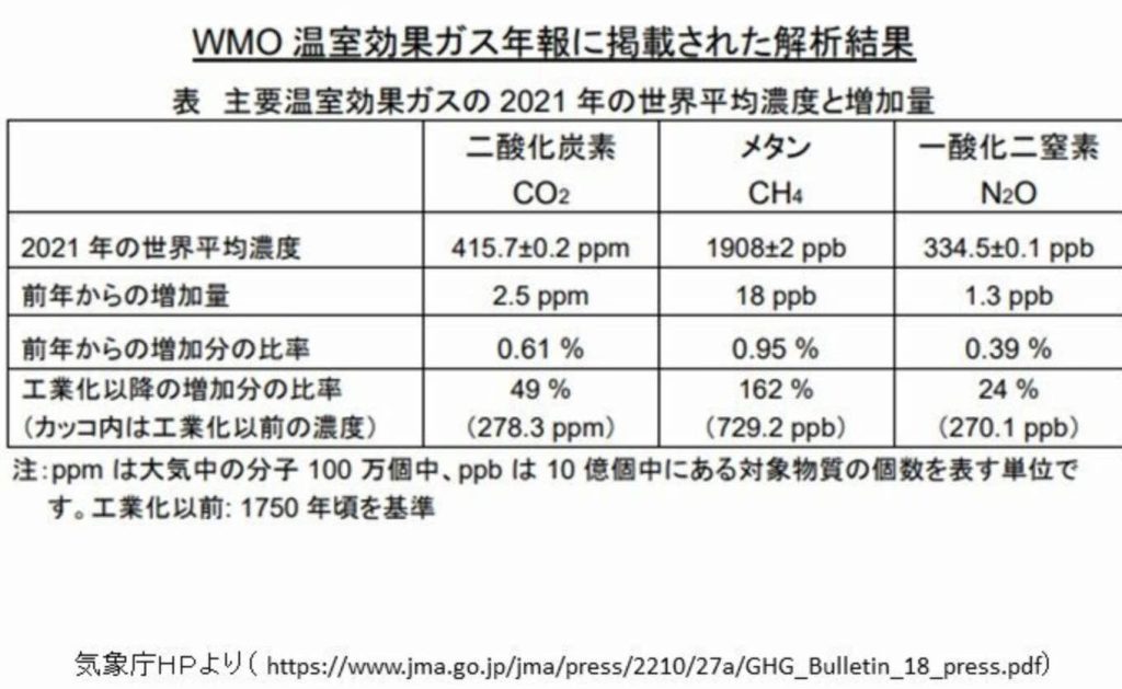 大気中の主要な温室効果ガス(二酸化炭素、メタン、一酸化二窒素)の2021年の世界平均濃度は、いずれも観測史上最高を更新しました。