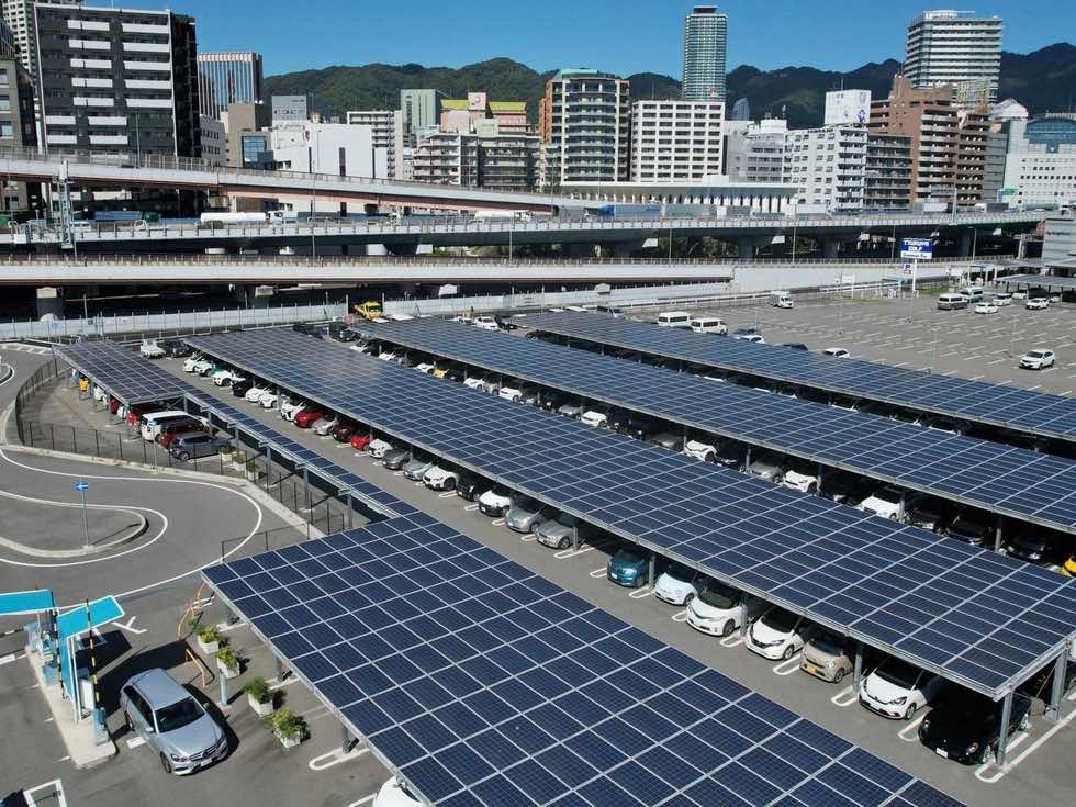 続々と開発される新しいパネルを、脱炭素に取り組む企業が導入を進め、設置場所にも工夫を凝らす。海に近く、周囲に高い建物が少ない神戸市中央区の時間貸し駐車場。395台分の屋根上にびっしりとパネルが張られている。