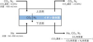 この混合イオン液体を多孔質材に含浸させることで、イオン液体膜を作製しました。作製したイオン液体膜の特性は図1に示すシステムで計測しました。膜の上流側にCO2とN2を混合したモデルガス(CO2濃度:0.04%)を、下流側にスイープガスとしてHeをそれぞれ供給しました。膜を透過したCO2とN2はHeと混合した状態で回収され、混合ガス中のCO2濃度は図1右下の式で表しました。イオン液体膜のCO2透過係数およびCO2/N2選択率を図2に示します。従来高分子膜の性能上限は、CO2透過係数が上がるとCO2/N2選択率が下がるトレードオフの関係を示し、CO2透過係数20,000 BarrerにおいてCO2/N2選択率は約20でした(図2中の実線)。図2に示すように、混合イオン液体膜の性能は、従来高分子膜の性能上限を大きく超えました。具体的には、大気中CO2と同程度の0.04%のCO2を用いた試験で、CO2/N2選択率は従来膜の約200倍に達しました。さらに、IL1の陰イオンの分子構造を最適化したイオン液体(IL1’)を開発することで、 CO2/N2選択率が1万を超えるイオン液体膜を開発することに成功し、最終的には約70%のCO2とすることができました。これは、DAC用分離膜の材料として最高クラスの性能であり、そのCO2/N2選択率は同等のCO2透過係数を示す従来高分子膜の約500倍に相当します。