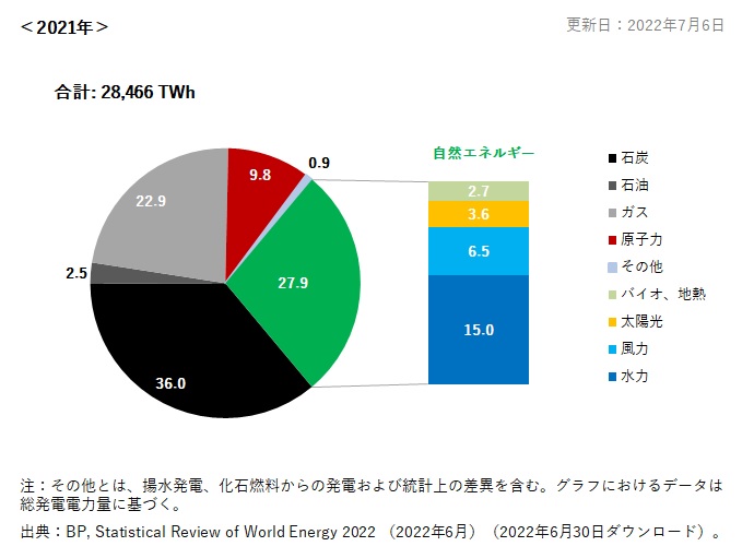 まず、世界の電源構成について最新2021年分の下記円グラフを見てください。