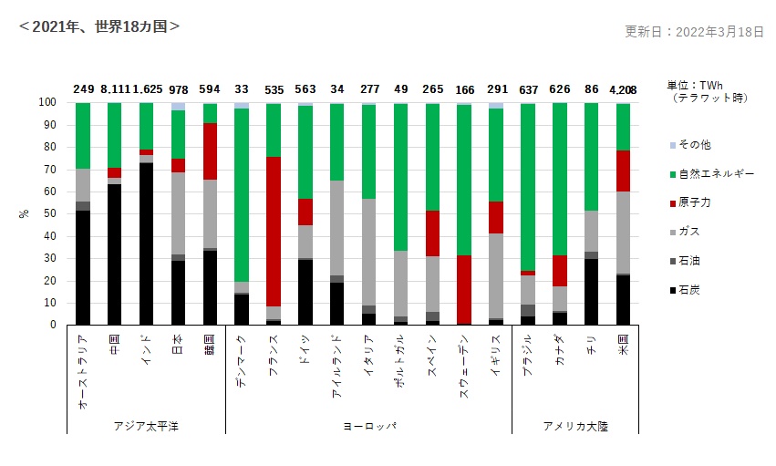今年のCOP27で日本は再度「化石賞」という不名誉(汚名)を言われた原因の石炭火力発電ですが、世界平均では36%あるんです。かたや日本は下図(各国毎の構成グラフ)を見ると30%前後。あれっ?そんなに責められるような数字じゃないですよね?まあ、政治的な駆け引きや思い込み、偏見もあるのかもしれません。物静かで言い返さない日本は、仮想◯◯に丁度いいのかもしれませんね。悔しいですが、我々日本は背筋を伸ばし、きちんと正論で進めるべきでしょう!ただ、もう少し反論を発信しても良いと思うのですが。。。