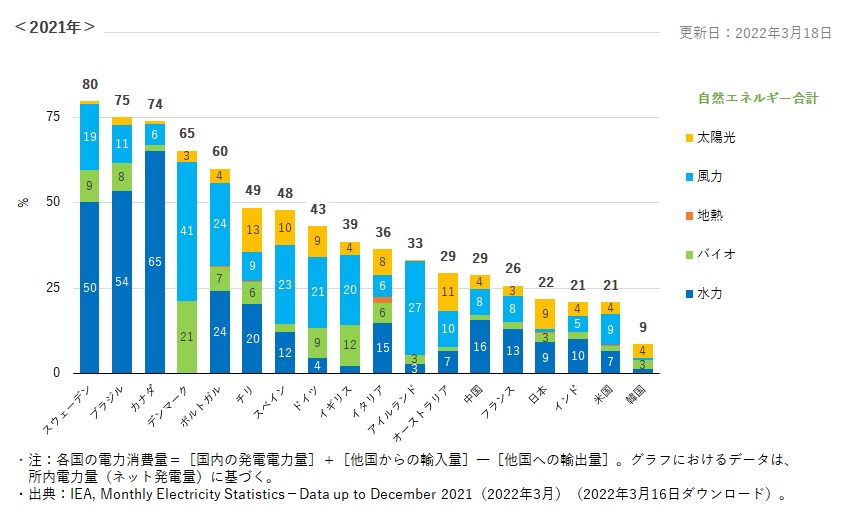 ヨーロッパは環境に積極的で自然エネルギー発電が多いという印象を広めています。下の図は電力消費に対する自然エネルギーの比率を国毎にあらわしたグラフです。たしかにヨーロッパ諸国は自然エネルギー発電が多いのですが、上位を見るとほとんどが水力発電であることがわかります。しかも水力発電に適した北欧のみ、風力はけっこう普及させているようですが、あんなに騒いだ太陽光発電の比率が意外と低いことに驚いています。ヨーロッパといっても原子力が6割以上のフランスは26%と低いのですが、カーボンニュートラルという意味では優秀な国なのでしょう。日本は22%ですがアメリカの21%よりは多いのです