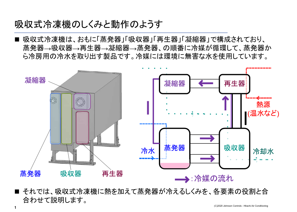 「冷蔵庫、エアコン、ビルなどの大型空調機器、スーパーマーケットのフリーザーなどが身近な冷凍機ですが、吸収冷凍機もその一種です。産業用途で使われ、地域冷暖房と呼ばれるエネルギーセンターや、食品関連などの工場、大型ビル、ショッピングモール、テーマパークなどで使われています。