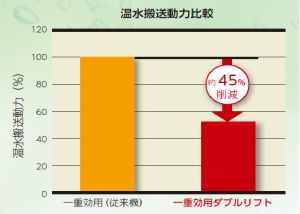 90℃から70℃で20℃分のエネルギーを使っていたものが、95℃から55℃になると40℃分になり、20℃から40℃に上がるので使えるエネルギーが増え、出てくる冷却の力も比例して増えていきます。従来の約2倍の温度差で熱回収が可能になり、熱量回収に要する温水流量の低減も可能になったことで、従来機に比べ温水搬送動力を約45%削減できます。