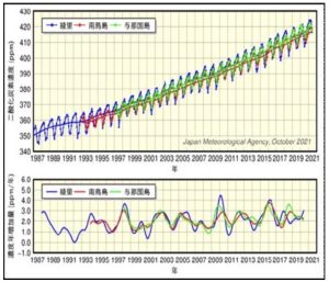 気象庁(JMA)HP掲載の、日本の3地点、綾里・南鳥島・与那国島のデータから、CO2濃度は1987年以降、いずれの地点においても上昇していること、また、ハワイ島での観測においても1958年以降上昇しており、その量は、63年間(1958~2021年)で99ppm(316→415ppm)の増加となっており、これより増加率は1.57ppm/年、またグラフの傾き等により、過去30年間のCO2増加率はほぼ一定であることが分かった。