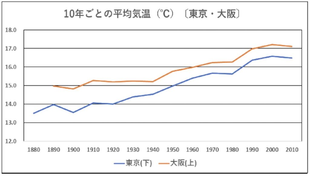 このように、特に、近年のCO2濃度上昇と気温変化は大きく乖離している。東京や大阪においては、「最近暑くなった、この原因はCO2濃度の上昇による地球温暖化だ」という言説は成立していない。