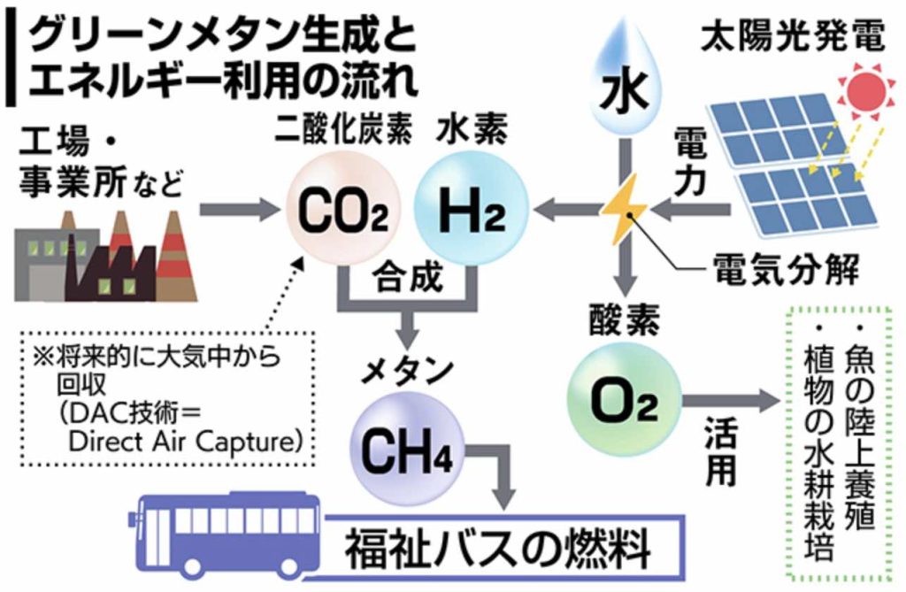 福島県相馬市は二酸化炭素(CO2)と再生可能エネルギー由来の水素を使って製造した合成メタン燃料「グリーンメタン」を使った社会実験に乗り出す。IHI(本社・東京)と市が連携して運営する施設で燃料を生産し、この燃料を使ったバスを2月から市内で走らせる。IHIによると、グリーンメタンを燃料として供給し、車両を走らせるのは国内初。両者は実験成果を脱炭素に向けた今後の取り組みに生かす。IHIは相馬市を拠点の一つにし、エネルギーを地産地消する循環型社会について研究を進める方針だ。