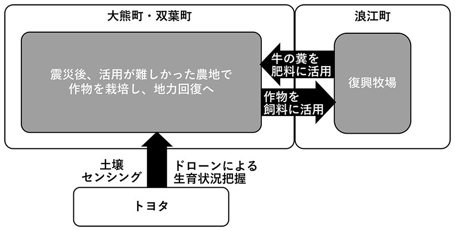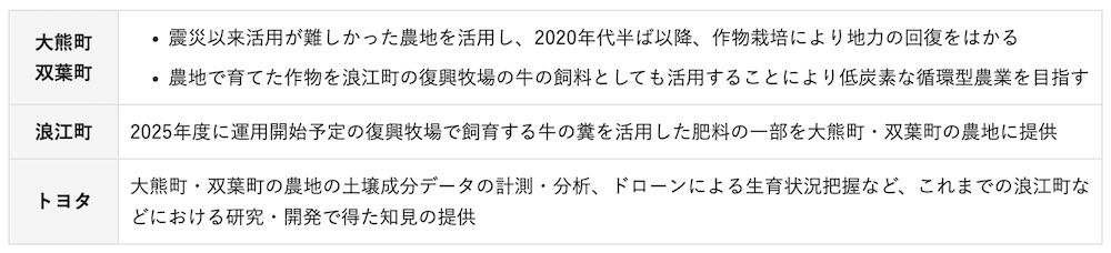 大熊町・双葉町・浪江町・トヨタは、震災からの復興に向け連携を深め、低炭素な循環型農業、肥料・飼料の地産地消による輸送時CO2削減などを通じて、カーボンニュートラルの実現に向けた取り組みを推進します。
