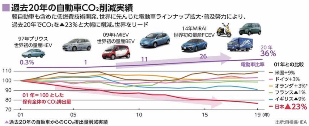 ニュース内にある「自工会が発表した、ここ20年の自動車のCO2削減実績を国別に示したグラフから、バッテリーEVメインの電動化を推進する諸外国が微増か微減といったレベルなのに対し、日本は23%という圧倒的な削減幅を達成している。ハイブリッドを軸に電動化を進め、脱炭素に取り組んできた日本の正当性を示しているデータだ」としているところが重要で正論なのですが、諸外国には別の思惑がありそうで正論だけではなかなか通じないものだと歯痒い気持ちいっぱいです