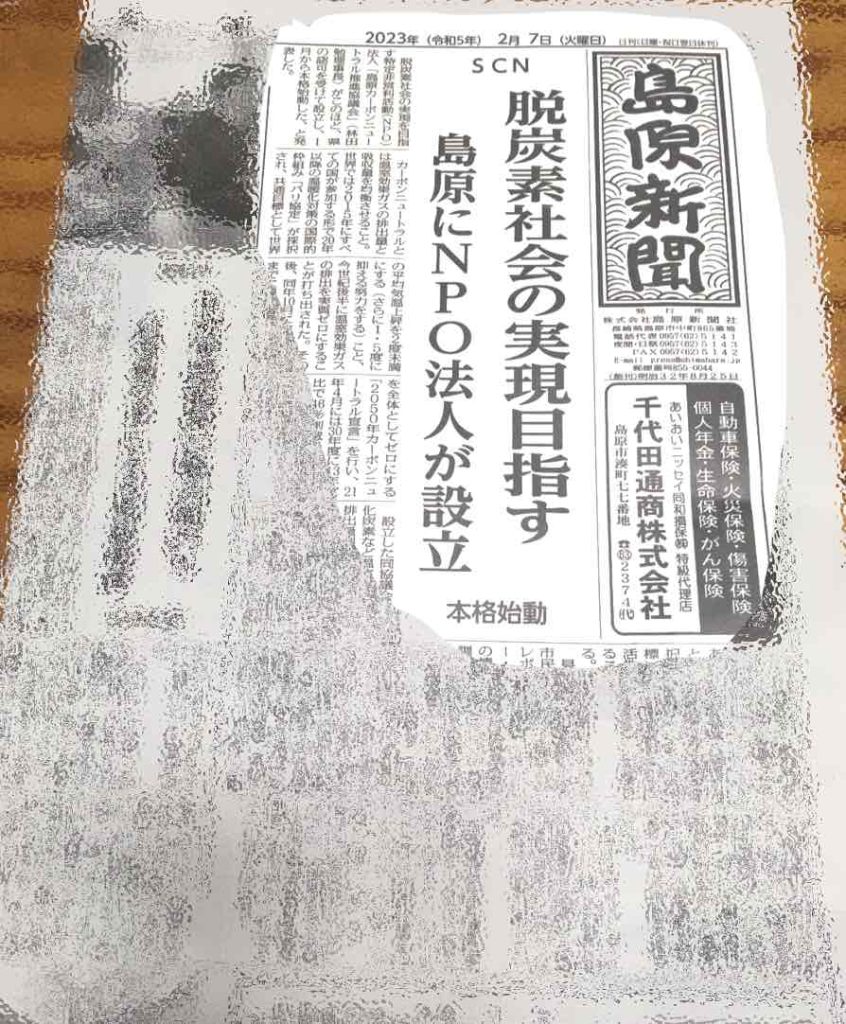 当島原カーボンニュートラル推進協議会が島原新聞に紹介されました 投稿者: scn-pc 投稿日: 2023年2月7日2023年2月7日 【SCN投稿記事のスタンス】←タッチしてご確認ください。 2023年2月7日付けの島原新聞に我々、NPO法人島原カーボンニュートラル推進協議会が紹介されました。 2022年末に長崎県からNPO法人として認可され、登記を行ったこと。本年2023年1月から本格活動を開始したことや活動内容を紹介して頂きました。 詳細は島原新聞をご購入のうえ、ご確認ください。 島原新聞から抜粋 続きを読む 前の記事 10年に一度のレベルの寒波の影響で、全国各地で大きな影響、さてEVは?次の記事 SCN月次レポート2023年2月号を公開しました