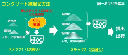 生コンは通常、全ての材料を一度に練り混ぜる。これに対してティー・カーボン・ミキシングでは、2度に分けて材料を練り混ぜる。製造の手順は次の通り。まず、コンクリートの材料のうち、水と結合材(セメントなど)、細骨材、化学混和剤の10~20%を先行して練り混ぜる。このときにCO2を噴霧し、コンクリート内部にCO2を固定する。