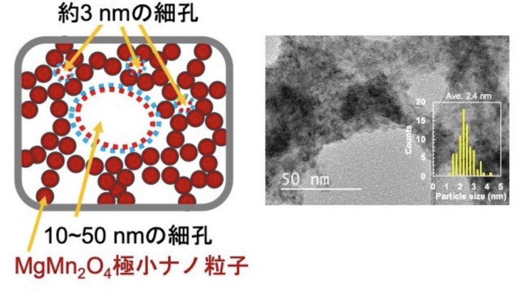 マグネシウムマンガン系酸化物(MgMn2O4)に着目。また、東北大学のナノ粒子化技術と慶應義塾大学の多孔質化技術を融合し、極小ナノ粒子を合成できる「アルコール還元法」と、多孔質粒子合成が可能な「凍結乾燥法」を組み合わせた技術を開発した。これを活用することで、粒子サイズ2.5nm以下で、比表面積500m2/g以上の超多孔質極小ナノスピネルの合成に成功した。これを正極に用いることで室温でもマグネシウム蓄電池を高エネルギー密度で動作することが可能になった。