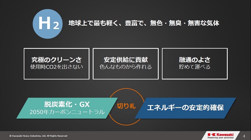 西村氏は、これら水素の特徴を挙げたうえで、「水素なしでは、日本のカーボンニュートラルは進まない」と続け、長年、水素に向き合ってきた川崎重工の取り組みを紹介。水素活用に向けてクリアしなくてはならない問題について明かした。