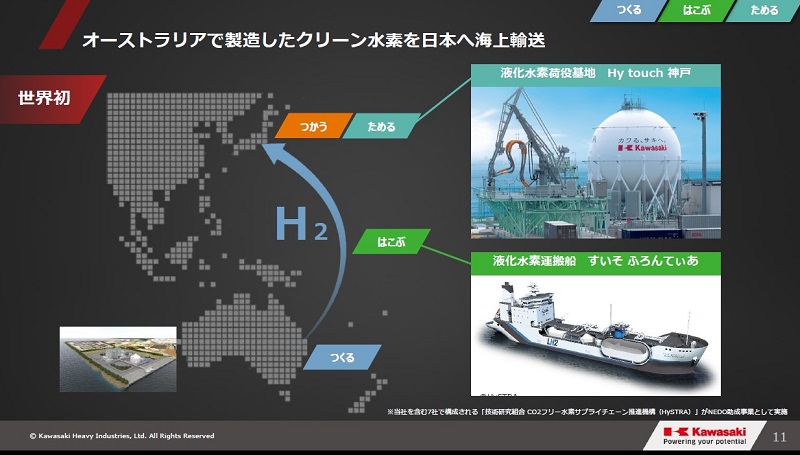 川崎重工は比較的早い段階からこの問題を捉え、水素活用に向けて挑戦を始めていた。「世界の人々の豊かな生活と地球環境の未来に貢献する“Global Kawasaki”」というグループミッションのもと、2010年から「水素」に着目し、中期経営計画において「水素エネルギーを利用できる仕組み作り」を宣言。当時は「夢物語と言われていた」と西村氏は振り返るが、1980年代からLNG(液体天然ガス:マイナス162℃)の運搬船、貯槽、受け入れ基地などの開発で培った極低温技術を生かして、官民一体の事業を強力に推進した。そして現在では、海外から安価に大量の水素を輸入する世界初の海外輸送プロジェクトを進めている。