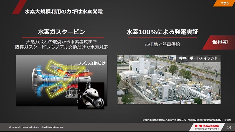 大規模利活用の鍵は水素発電だ。水素の大量需要によってコストをさらに押し下げることができるのは、天然ガス導入の歴史から実証済みといえる。この事例を参考に川崎重工は、産業向けの発電用天然ガス焚きガスタービンで水素対応できる開発を行い、世界初となる市街地での水素燃料100%による発電実証を実施。水素由来の熱と電気を近隣の公共施設に供給した。
