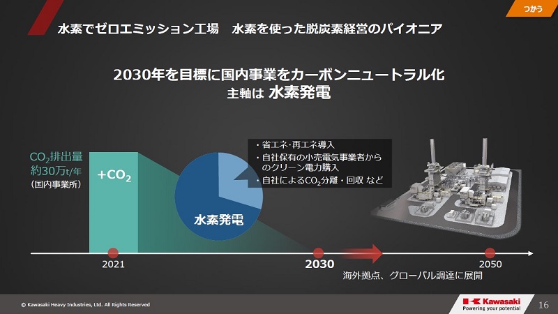 このように川崎重工は、長年培った技術を生かし、水素社会実現に向けて先進的な試みを続けている。さらに「今後は水素発電で培った燃焼ノウハウを生かして、水素エンジン分野にも積極的な挑戦を続けたい」との意向も西村氏は示した。すでにパートナー企業とともに、船や飛行機、二輪車などでの水素エンジン実用化を目指し歩みを進めている。これと同時に、自社でも率先して「水素発電」などの水素利用を進め、2030年を目標に国内事業のカーボンニュートラル達成を目指すという。