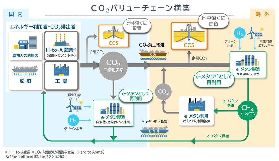 本検討では、大阪ガスが社会への導入を進めるe-methaneやCO2貯留に関する知見と、三菱重工が社会への導入を進めるCO2回収、液化CO2の船舶輸送、CO2マネジメントに関する知見を組み合わせ、効率的なCO2バリューチェーン構築の実現可能性を検証とのこと。